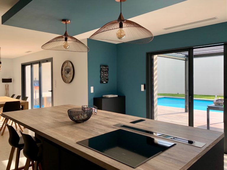 Les tons profonds fonctionnent particulièrement bien dans un contexte moderne : bleu nuit, vert mousse, anthracite satiné. Pas besoin d’en mettre partout. Un îlot central dans une couleur tranchée au milieu d’une composition plus neutre, c’est souvent suffisant pour donner à l’espace une vraie personnalité.